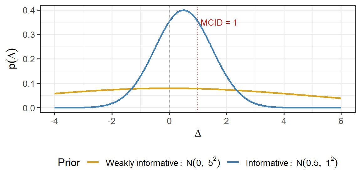 Figure 1: Prior distributions on Delta. The weakly informative prior expresses minimal prior knowledge. The informative prior reflects a pilot study suggesting modest benefit.