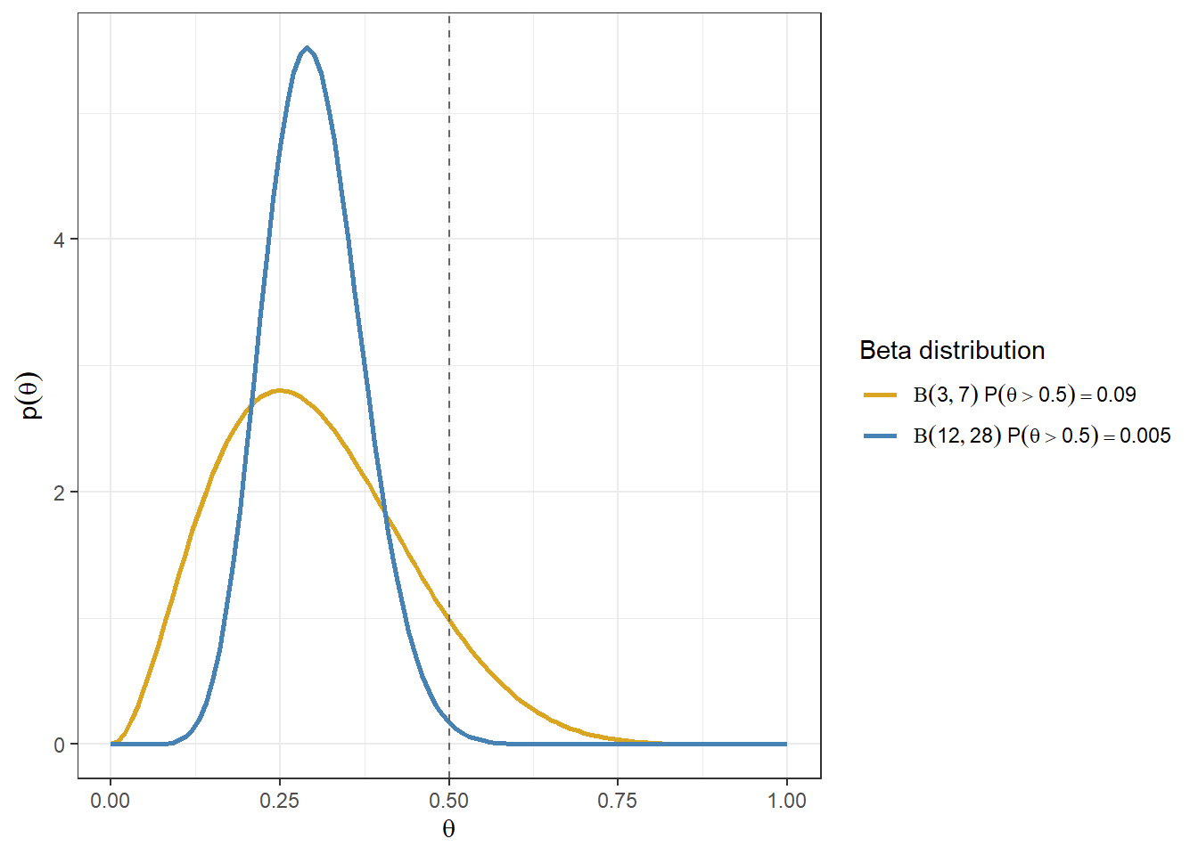 d <-tibble(theta =seq(from =0, to =1, length.out =101)) %>%expand(theta, a =c(3, 12), b =c(7,28)) %>%mutate(PriorSet =paste0("Beta(",format(a), "," , format(b),")")) %>%mutate(priorDensity =dbeta(theta, shape1 = a,shape2 = b))%>%filter(a/(a+b)==0.3)# Compute P(theta > 0.5) for each priorprob_table <- d %>%distinct(a, b, PriorSet) %>%mutate(prob_gt_05 =pbeta(0.5, shape1 = a, shape2 = b, lower.tail =FALSE),label =paste0(PriorSet, "~P(theta>0.5)==", round(prob_gt_05, 3)))# Merge labels back for plottingd <- d %>%left_join(prob_table %>%select(PriorSet, label), by ="PriorSet")ggplot(d, aes(theta, priorDensity, colour = label)) +geom_line(size =1) +geom_vline(xintercept =0.5, linetype ="dashed", colour ="grey40") +xlab(expression(theta)) +ylab(expression(p(theta))) +theme(legend.position ="bottom") +scale_colour_manual(values =c("goldenrod", "steelblue"),labels = scales::label_parse(),name ="Beta distribution") +theme_bw()