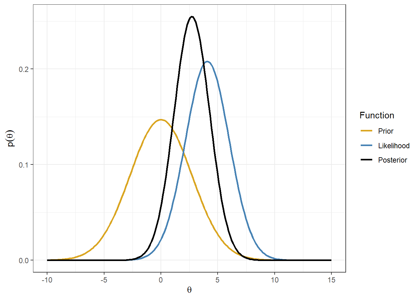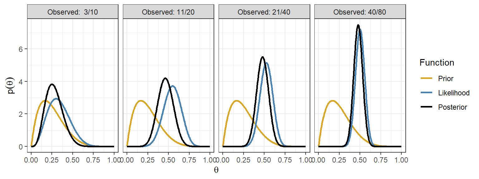The key idea in Bayes’ theorem is that the posterior distribution is proportional to the likelihood times the prior: \[P(\theta \mid y) \propto P(y\mid \theta)P(\theta).\]