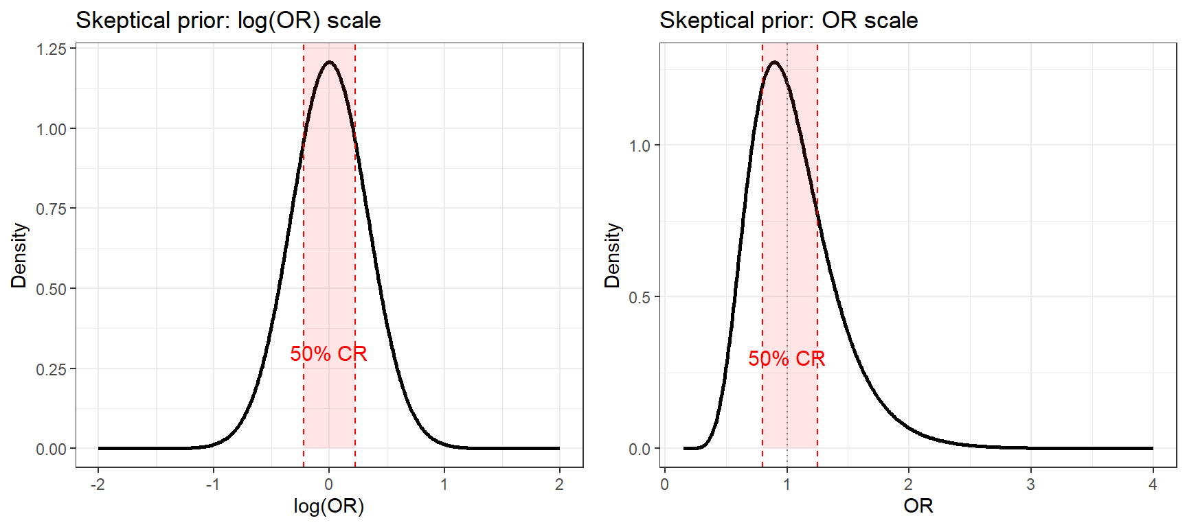 - On the log(OR) scale the prior is symmetric, the normal distribution is centered at 0 (OR = 1) and the 50% credible region (shaded) spans the similarity zone (0.8, 1.25).