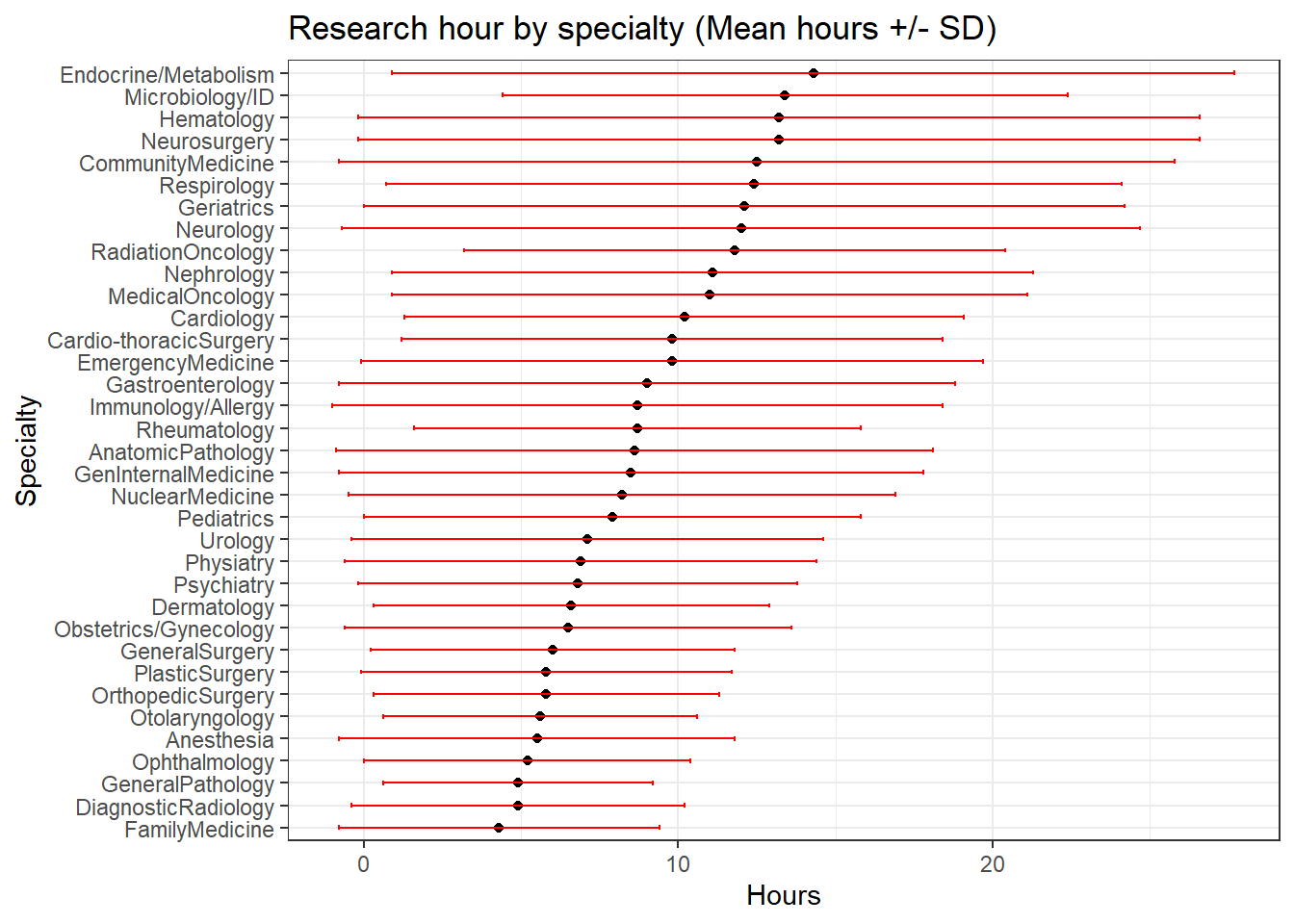 labs(title = paste("Research hour by specialty", "(Mean hours +/- SD)", sep = " "))+