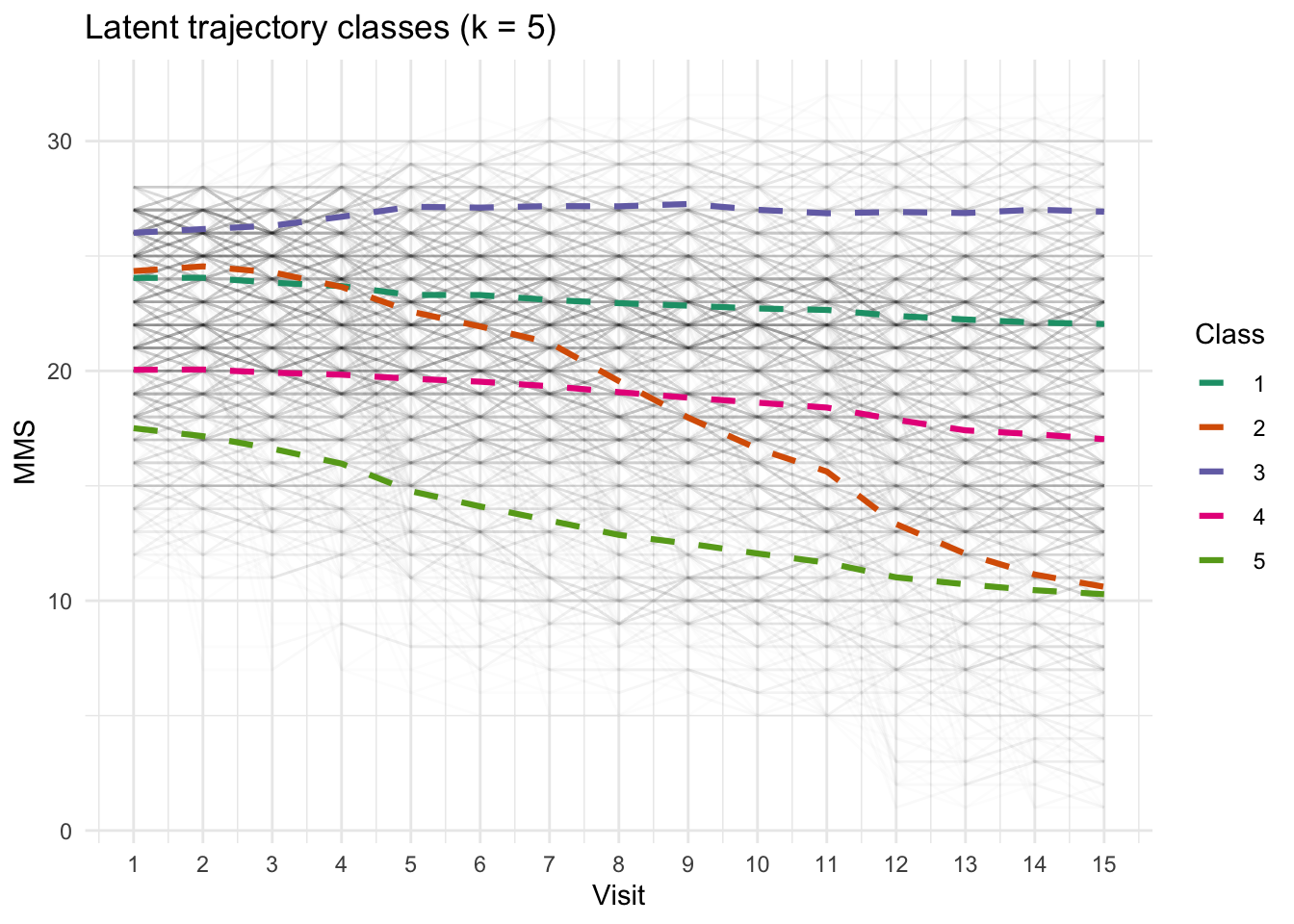 library(flexmix)set.seed(123)# 3-class modelmod3 <-flexmix( MMS ~poly(visit, 2, raw =TRUE) | id,data = ictus_long,k =3,control =list(minprior=0) # by default flexmix drop a class if miniprior threshold less than 0.05;)# BIC for 3-classBIC(mod3)