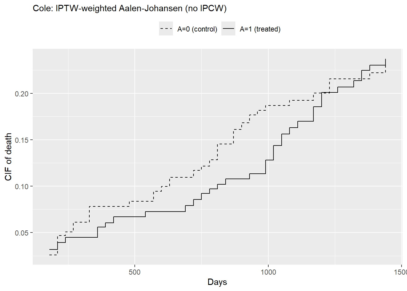 # cause-specific CIFts <-seq(180, 180*8, by=30)F1_curve <-predict(fit_cif_AJ, cause =2, times = ts, newdata =data.frame(A=1))F0_curve <-predict(fit_cif_AJ, cause =2, times = ts, newdata =data.frame(A=0))df_AJ <-data.frame(t=ts, F1=F1_curve, F0=F0_curve, dF=F1_curve-F0_curve)ggplot(df_AJ, aes(x = t)) +geom_step(aes(y = F0, color ="A=0 (control)", linetype ="A=0 (control)")) +geom_step(aes(y = F1, color ="A=1 (treated)", linetype ="A=1 (treated)")) +scale_color_manual(name ="",values =c("A=0 (control)"="black", "A=1 (treated)"="black") ) +scale_linetype_manual(name ="",values =c("A=0 (control)"="dashed", "A=1 (treated)"="solid") ) +labs(x ="Days",y ="CIF of death",title ="Cole: IPTW-weighted Aalen-Johansen (no IPCW)" ) +theme(plot.title =element_text(size =11),legend.position ="top")